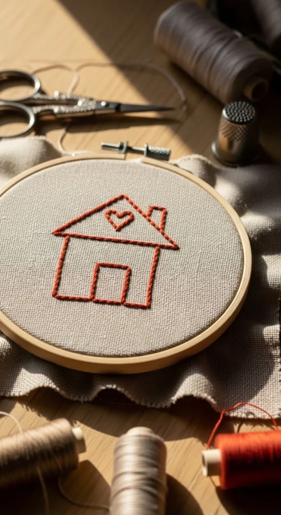 A tiny house outline is a charming beginner design that works especially well if you like simple line art. The basic shape is just a square or rectangle with a triangle roof, door, and little windows, which makes it easy to draw and stitch. Use backstitch for the outline and add one or two small details like a heart, flower pot, or smoke curl if you want extra personality. This design stays low-cost because you can finish it with one main thread color and maybe one tiny accent shade. It looks lovely in a hoop for home decor, and it also works well on a gift pouch or as part of a housewarming card. If you are brand new, keep the shape bold and simple. Tiny window grids can wait until later if you want to avoid extra detail. This project is useful for practicing straight lines, corners, and shape balance, which are all helpful basic skills. It also gives a cozy handmade result that feels meaningful without taking a long time. A stitched little house has a warm personal feeling, and that makes it a nice beginner piece when you want something simple but not plain.