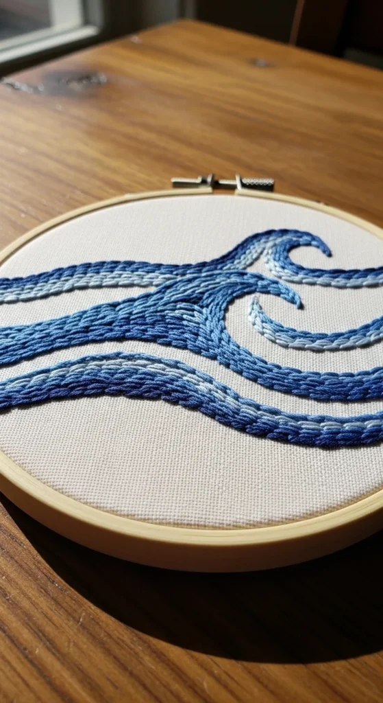 Simple ocean waves are a relaxing embroidery design for beginners because the pattern is built from repeating curved lines. You can stitch one row of waves or several stacked lines using blue thread in different shades. Backstitch and split stitch both work well for this design, and the repeated curves help your hands settle into a steady rhythm. This is an affordable project because it uses little thread, and even one blue shade can still create a beautiful result. Wave lines look nice in small hoops, on pouches, or on the corner of a beach tote or travel bag. If you want a calm minimal look, use one dark blue line across plain fabric. If you want more movement, add two or three rows in different blue tones. You can even stitch a tiny sun above the waves for a fuller scene. This project is helpful because it lets you practice smooth curved stitching without the pressure of fine details. The design feels peaceful and modern, and it finishes fairly quickly, which is perfect when you want a beginner project that looks clean and handmade without taking up an entire weekend.