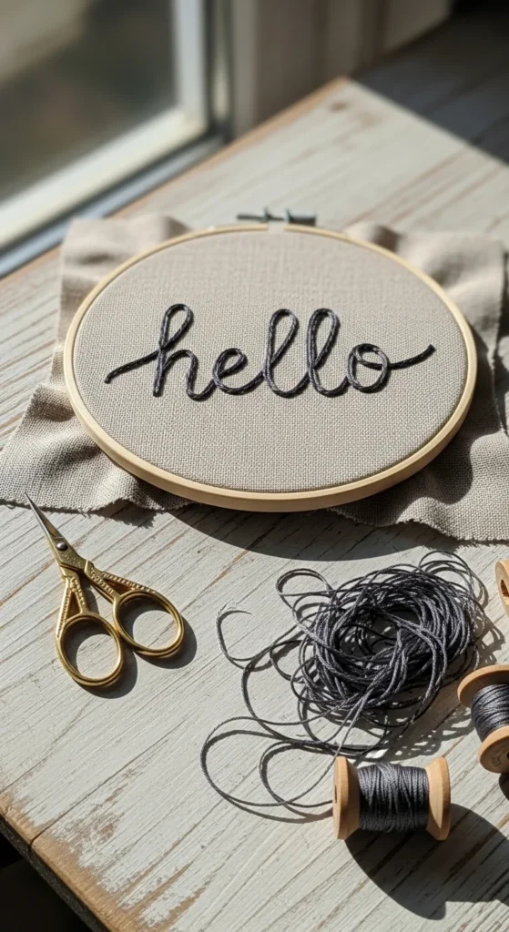 Short word lettering is a useful beginner embroidery project when you want to practice writing with thread in a very manageable way. Instead of stitching a whole quote, choose one short word like hello, joy, calm, or home, then trace it in a simple script or neat print style. Stitch over the guide using stem stitch, split stitch, or backstitch, depending on the look you like. This project is low-cost because one word uses little thread and fits on a small hoop or fabric scrap. It is also personal, which makes it nice for gifts, desk decor, pouches, or journal covers. If cursive feels hard, use block letters instead. Straight shapes are easier to keep neat. You can add a tiny dot, leaf, or heart near the word if you want a little decoration, but the lettering alone can still look beautiful. This design helps beginners learn how to move the needle along curves and sharp turns in a controlled way. It also gives a result that feels custom and handmade without needing a large pattern. A single embroidered word can say a lot while still being simple enough to finish in a short stitching session.