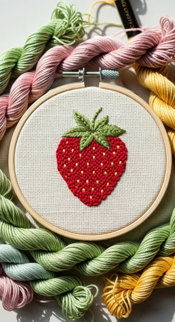 A sweet strawberry motif is a perfect beginner design because it combines a simple fruit shape with tiny details that are still easy to manage. The strawberry body can be outlined and lightly filled in red or pink thread, while the top leaves can be stitched in green using small satin stitches or straight stitches. Tiny seed marks can be added with short yellow or white stitches if you want more texture. This is a budget-friendly project because the motif is small and works well with just three thread colors. It looks adorable on bookmarks, napkins, pouches, children’s items, or mini hoops. If you are just starting, keep the strawberry shape broad and avoid making the seeds too tiny. A few marks are enough to suggest the texture. If you want a fuller composition, add one little flower or leaf next to the fruit. This project is helpful because it teaches you how to combine outline, light fill, and accent details in one small design. The result feels cheerful, handmade, and easy to show off. A stitched strawberry has a cozy homemade charm that makes it a fun final project for beginners who want something cute and simple.