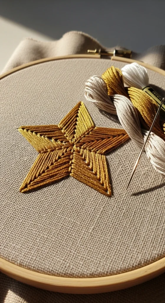 A little star outline is a great practice design if you want something quick that still looks neat and decorative. The shape is made from straight lines, so it feels less tricky than rounded flowers or letters. You can stitch the star with backstitch for a clear outline or use running stitch if you want a softer handmade look. This is a good project for beginners because it teaches line control and corner turns without requiring a filled design. It is also very cheap to make since a single color works well. Gold, white, navy, or soft yellow all look pretty on plain fabric. One small star can make a cute ornament-style hoop, while several stars can be scattered across a pillow cover, pouch, or fabric bookmark. If you want to make the design feel more magical, add a crescent moon or a few tiny dots around it. If you want something very minimal, stitch one star only and leave lots of open fabric around it. That empty space makes the shape stand out. This is the kind of project that finishes fast, helps your hand get steady, and gives you a clean result without asking for much thread, time, or planning.