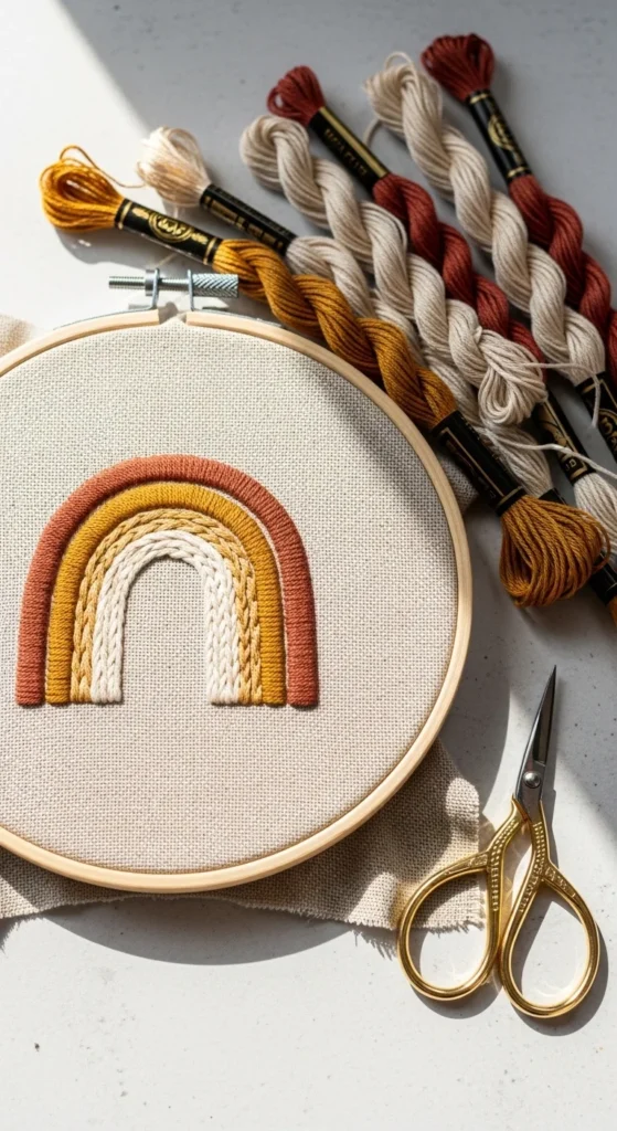 Easy rainbow arches are perfect for beginners because the design is made from repeated curved lines, which helps you practice neat spacing without making the project feel too hard. Each arch can be stitched with backstitch, split stitch, or even running stitch if you want a softer look. You only need three or four colors, and muted shades like terracotta, mustard, blush, and cream make the design look modern and cozy. This project is budget-friendly because it uses simple lines instead of complex fills, so thread lasts longer and the design finishes faster. A rainbow arch looks lovely in a small hoop for wall decor, but it also works well on baby gifts, notebook covers, or small pouches. If you want to make it even easier, draw the arches lightly with pencil first so you have a guide. If your curves are not perfectly smooth, the finished piece will still look sweet because the repeated lines create a pattern that pulls the design together. You can add tiny dots below the rainbow or keep it plain. This is a cheerful project that helps build stitching rhythm while giving you something bright and handmade to enjoy right away.