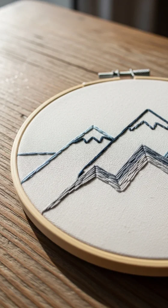 Minimal mountain peaks are a smart choice if you like clean designs and want a project that uses mostly straight lines. This kind of pattern is ideal for practicing backstitch because the mountain edges can be drawn as simple angled shapes. You can stitch one peak, three peaks, or a small range with a sun above it. Gray, blue, brown, or dark green all work well, especially on neutral fabric. This design is great for beginners because it avoids tiny details and still looks finished very quickly. It is also low-cost because one or two thread colors can carry the whole piece. Mountain embroidery looks nice in a hoop, but it also works well on a canvas pouch, tote bag, or journal cover. If you want a little extra detail, add a tiny line of snow on the peaks using white thread. If you want to keep the project very basic, make the mountains outline-only and stop there. That clean style can look very modern. This project helps you learn how to keep stitches even along long lines, and it gives a simple handmade result that feels calm, outdoorsy, and easy to complete in one cozy craft session.