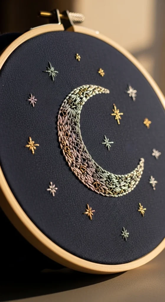 A crescent moon and dots design feels dreamy and simple at the same time, which makes it a lovely beginner project. The moon shape can be outlined with backstitch or filled with satin stitch if you want a fuller look, and the surrounding dots can be made with tiny straight stitches or French knots. This is an easy way to practice both curved lines and small accent details in one design. It also stays affordable because you only need one main color and maybe one lighter accent. White or gold-look thread on dark fabric creates a nice night-sky effect, while navy or mustard on cream fabric gives a softer style. This pattern works well in a small hoop, on a pouch, or on the corner of a pillowcase. If you are just starting, keep the moon medium-sized and place only a few dots around it. That way the design stays clean and easy to manage. If you want more interest later, add a few tiny stars or a second small moon. This embroidery idea feels peaceful, personal, and fast to finish. It gives you a pretty result without asking for many materials, and it helps you build confidence with curved stitching.