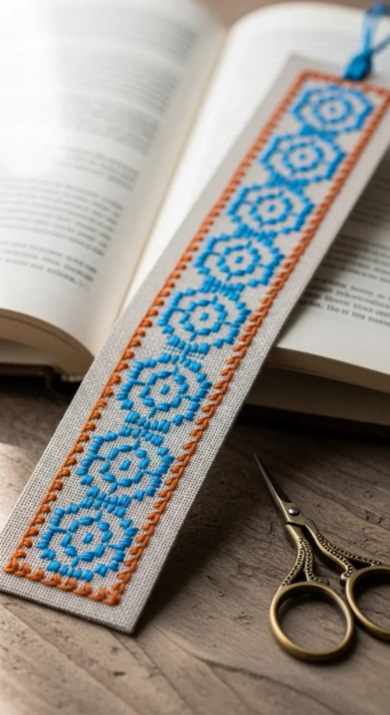 A repeating border bookmark is an excellent project for beginners because it teaches steady stitching through small repeated shapes. You can make the border with little triangles, dots, dashes, or tiny leaves, using running stitch and backstitch for most of the work. The beauty of this idea is that it turns a simple strip of fabric into something useful without needing a large or detailed pattern. It is also one of the most budget-friendly options on this list because you can use leftover thread and small fabric scraps. This makes it a good practice piece when you do not want to commit to a full hoop design. Use one color for a neat look or two colors if you want more contrast. A handmade bookmark also makes a lovely gift, especially when paired with a notebook or novel. If you want to keep it extra easy, stitch one border line on each side and leave the center plain. If you want more detail, add a tiny initial or heart in the middle. This project is helpful because it builds muscle memory through repetition, and it gives you something practical at the end. Simple repeated stitches can teach a lot while still feeling calm and enjoyable.