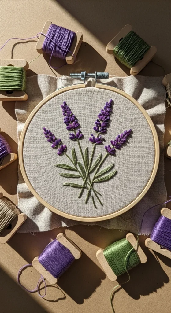 A lavender stem sprig is a beautiful beginner embroidery design because it looks delicate but uses very simple repeated stitches. The stem can be worked in backstitch, while the little purple buds can be stitched as short straight stitches or tiny lazy daisy loops. Once you repeat the buds along the line, the design starts to look polished very quickly. This is a nice low-cost project because you only need two or three thread colors, and it works beautifully on plain cotton or linen. Lavender also suits many handmade items, from wall hoops to hand towels and little fabric pouches. If you want a clean modern look, stitch one small sprig in the center of the fabric. If you want something fuller, create three stems tied together like a mini bouquet. The shape is forgiving, so even if the buds are not perfectly even, the final piece still feels charming and soft. This design is helpful for beginners because it teaches how to place small stitches close together without becoming overwhelming. It is also a relaxing project for evenings when you want something pretty and easy that can be finished without much setup or stress.