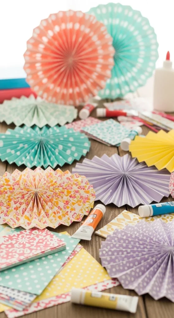 Accordion fans are easy paper crafts that look decorative and can also be used on warm days, party tables, or wall displays. The method is simple: fold a strip or sheet of paper back and forth into even pleats, then secure one end or join two folded pieces into a circle. That is all it takes to make a fan shape that feels playful and classic. This project is ideal for beginners because the folds repeat again and again, so the rhythm becomes easy. Thicker paper makes sturdier fans, but lighter paper is easier for young children to fold. You can decorate the paper before folding with paint, dots, stamps, or marker lines if you want more color. Fans can be kept flat and handheld, turned into wall rosettes, or tied together into hanging decor for birthdays and seasonal events. If you are short on supplies, plain printer paper still works for small versions. These look especially pretty in grouped sizes and mixed colors. Since the project uses only folding and a bit of glue or tape, cleanup is easy too. Accordion fans are a nice papercraft choice when you want something fast, decorative, and satisfying to make in multiples.