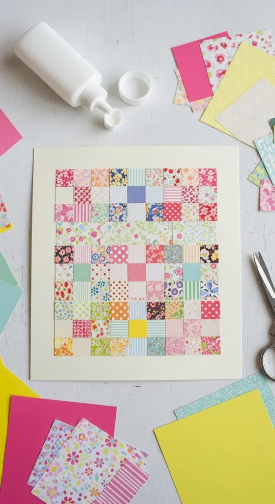Paper quilt crafts take the idea of fabric patchwork and recreate it with paper scraps, which makes them great for using leftover patterned pieces from other projects. The basic method is simple: cut small squares, triangles, or rectangles and arrange them into a repeating pattern on a background sheet. This can become wall art, greeting cards, notebook covers, or framed mini decor. The beauty of paper quilts is that they look thoughtful and detailed without being difficult to make. Choose a color palette before you begin so the patchwork feels organized. Soft florals can look vintage, while bright geometric prints feel more playful. This project works well for adults who enjoy neat layout-based crafts, but kids can also join in with larger pieces and simpler shapes. A ruler helps if you want cleaner lines, though uneven handmade edges can still look charming. You can also add faux stitching with a pen around the shapes if you like the quilted look. Since this uses small scraps, it is a smart low-waste project. It turns paper leftovers into something decorative and structured. For anyone who likes order, color matching, and easy assembly, mini paper quilts are a fun and satisfying choice.