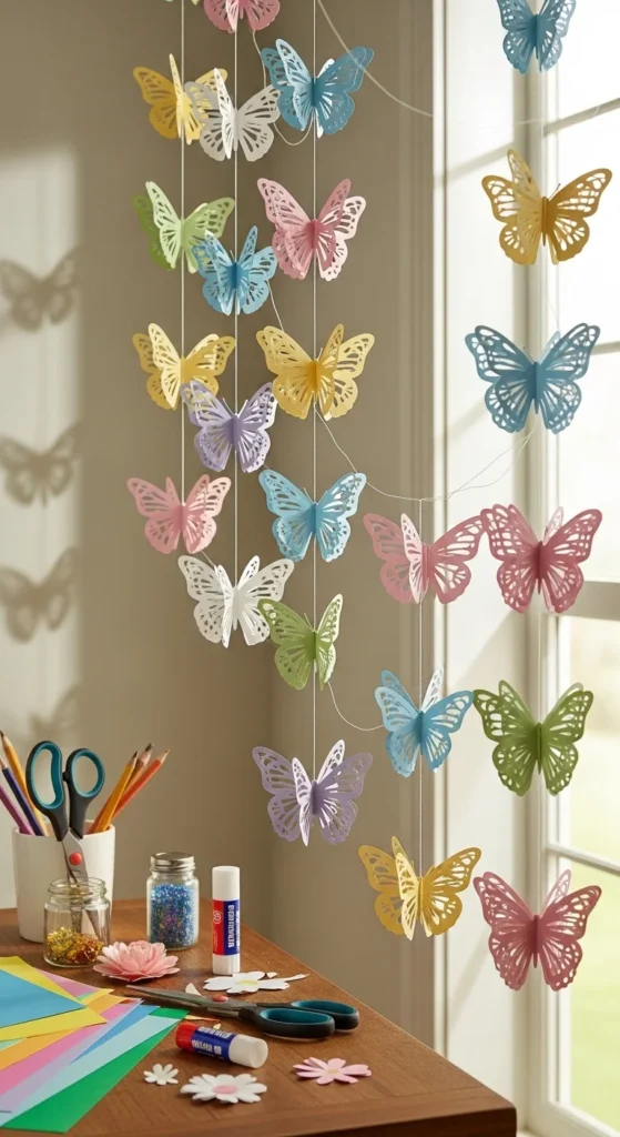 Butterfly garlands are light, pretty, and simple enough for many skill levels. They work well for bedrooms, parties, classrooms, baby showers, and spring decor. Start by cutting butterfly shapes from colored paper or tracing a simple template. Fold each butterfly slightly down the center so the wings lift up and look more alive. Then glue or tape the butterflies onto string, ribbon, or clear thread. You can mix sizes for a more flowing look, or keep them all the same for something cleaner and more symmetrical. Layering two butterflies together with slightly different colors also adds depth without much effort. This is a good paper craft for group settings because each person can decorate or cut a few butterflies and then help build the garland. Paper scraps work well here, which makes the project affordable. If you want a more delicate finish, use pastel paper or pages from old book sheets. For a brighter party style, choose bold rainbow colors. Once hung, the lifted wings catch light nicely and make the garland feel more detailed than it really is. It is a cheerful project that looks sweet in almost any room without taking much time.
