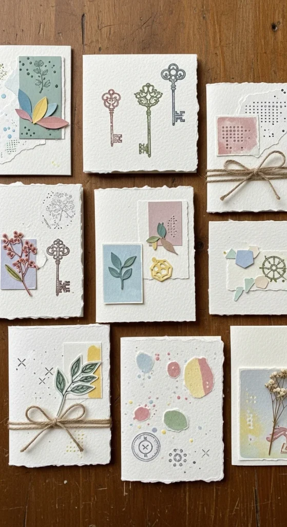 Stamped paper cards are a nice way to mix simple paper crafting with a bit of surface design. The base can be very easy: folded cardstock, one paper layer, and a stamped motif repeated a few times. Leaves, dots, flowers, hearts, stars, and simple lines all work well. This project is good for beginners because it does not ask for complex cutting or folding, but it still feels more custom than a plain note card. Start with a simple card base and add one contrasting paper panel on top. Then stamp your chosen pattern lightly around the edges or in a little cluster near the center. If you do not own stamps, homemade foam stamps or cut sponge shapes can work too. A small label shape or paper strip can finish the design. These cards are useful for birthdays, thank-you notes, gift enclosures, and holiday greetings. Since you can make several from the same set of supplies, it is also a budget-friendly craft. Mixed media cards are ideal for people who want to try paper crafting in a practical form. They are easy to personalize, simple to store, and satisfying to give away as handmade pieces.