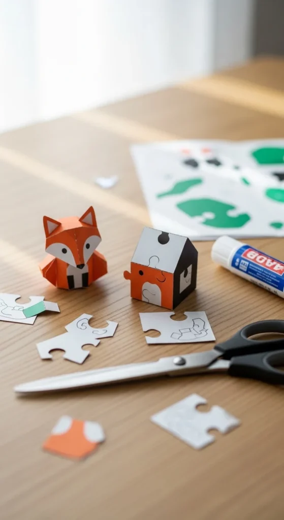 3D paper puzzle models are a fun step up from flat paper crafts because they turn cut pieces into little standing objects. Simple versions can include animals, houses, cubes, robots, or decorative geometric forms. Many printable templates are available, but you can also start with basic box shapes and build from there. This project is good for older kids, teens, and adults who want a paper craft that feels more like building than decorating. Use slightly thicker paper or light cardstock so the finished shape stands properly. Score the fold lines gently before folding if you want cleaner edges. Glue tabs hold the form together, and clips can help while the glue dries. A basic 3D model does not need many supplies, but it does give the satisfying feeling of assembling something with structure. This makes it a nice choice for gifts, desk decor, classroom projects, or rainy-day crafting. If a complex template feels frustrating, start with a cube animal or tiny house shape first. Once you understand tabs and folds, bigger models get easier. It is a smart project for anyone who enjoys puzzles and wants paper crafting to feel a little more hands-on and architectural.