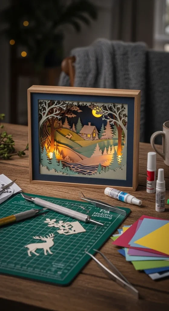 A light-up paper shadow box feels magical, but a beginner-friendly version can still be fairly simple. The idea is to layer cut paper shapes inside a shallow frame or box so the scene has depth, then place a small battery LED light behind or around the layers. Trees, stars, city skylines, moon scenes, hearts, and winter cottages all work beautifully. Start with a small box or deep frame and cut two or three paper layers rather than many. Space them slightly apart with folded cardstock strips or foam pieces. The more layers you add, the more detail you can create, but even a simple scene looks lovely when lit. This project is best for older kids with help, teens, or adults because it asks for careful cutting and layering. Still, the method is not too complicated if the design stays simple. LED tea lights or tiny battery fairy lights are usually the easiest option. The result makes beautiful shelf decor, a gift, or a seasonal display piece. It is a great example of how paper crafting can move beyond flat pages into something more atmospheric while still using low-cost materials and a fairly simple setup.