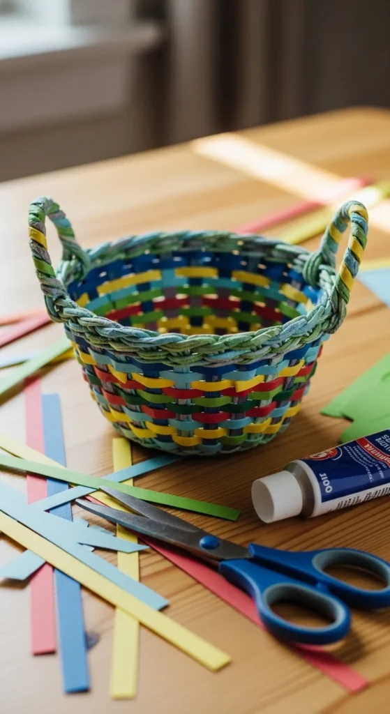 A woven paper basket is a lovely next step after trying flat paper weaving. It uses the same basic over-and-under idea, but the final piece becomes something you can actually use for small items like clips, candies, paper flowers, or craft scraps. This makes it feel a little more practical while still staying beginner friendly. Start with a small basket shape so the project stays manageable. Construction paper works well, though slightly thicker paper may hold the sides better if the basket is meant to stand up. Cut strips evenly, weave them around a square or simple shape, and secure the ends with glue. A folded paper handle can finish it off. If you are making these with kids, smaller baskets for fake fruit or tiny treats work especially well. For adults, neutral or pastel paper gives a cleaner decorative look. This is also a smart way to use leftover paper from other projects. Add a paper tag, flower, or ribbon if you want more detail. Woven baskets show how basic paper strips can become something surprisingly sturdy and useful. They are great for Easter, party tables, gift packaging, or desk storage without costing much at all.