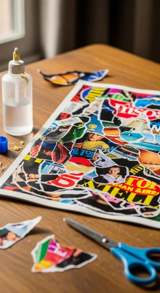 Torn paper collage is perfect for people who want to make art without needing precise cutting or drawing skill. Instead of scissors, you tear paper into shapes and layer the pieces to build landscapes, animals, flowers, abstract scenes, or playful patterns. The torn edges give the finished work a soft textured look that feels handmade in the best way. This is also one of the easiest zero-waste paper crafts because you can use old magazines, junk mail, wrapping paper scraps, book pages, or leftover cardstock from other projects. Start with a simple idea like a tree, rainbow, fish, or house silhouette. Tear paper into basic shapes and glue the pieces onto a thicker background sheet. It works well for both kids and adults since the process is open-ended and forgiving. There is no pressure for perfect lines. If you want more structure, choose a two-color or three-color palette before starting. That keeps the collage looking cleaner. Torn paper art is also a great boredom buster because it uses supplies many people already have at home. It turns scraps into something bold and creative. Framed or pinned up, these collages can even become cheerful handmade wall decor.