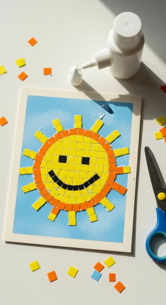 Paper mosaic art is made by gluing many small paper pieces onto a base to create a larger image. It is a great project for anyone who enjoys repetitive crafting and wants something that feels detailed without being difficult to understand. Start with a simple shape such as a heart, fruit, sun, animal, or geometric pattern. Then cut or tear paper into tiny squares, rectangles, or little irregular pieces and fill the design slowly. This works well with colored paper, magazine scraps, wrapping paper, or even paint sample cards. A limited palette can make the finished piece look more polished, while mixed bright colors create a playful style for kids’ rooms or classrooms. The process is calm and satisfying because you build the image little by little. It is also a good project for using up offcuts from other crafts. If cutting lots of pieces feels tiring, keep the design small and simple. These mosaic panels can become cards, framed mini art, gift tags, or notebook covers. Since the method is easy to repeat, it suits a wide range of ages and skill levels. It is a nice mix of patience, color play, and low-cost creativity.