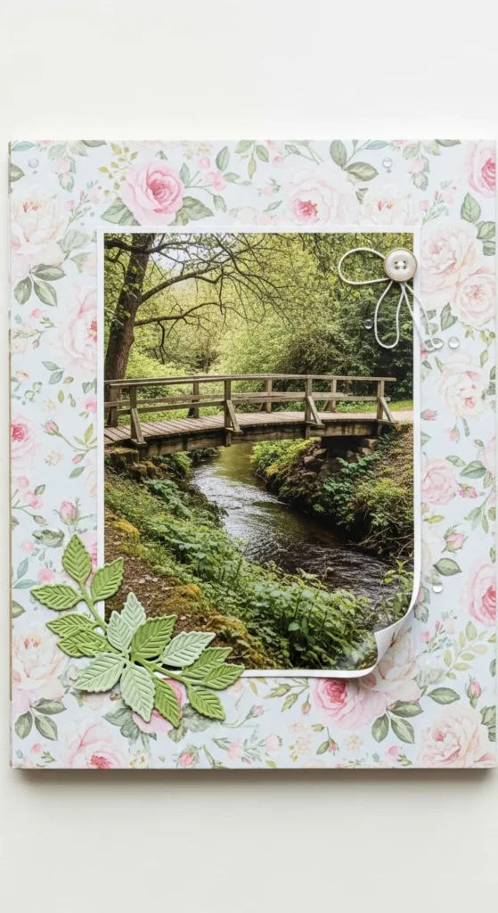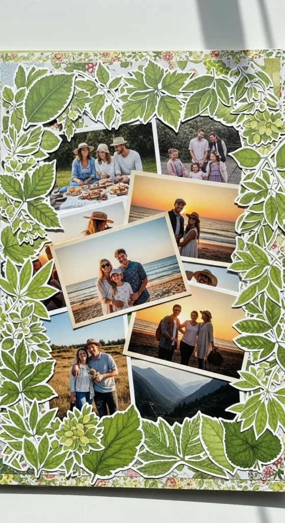 A botanical border layout brings soft nature-inspired charm to your scrapbook. Start with a plain background and use leaf or floral patterned paper to create a border along the edges. Trim the paper into strips and layer them slightly for depth. Place your photos in the center so they stand out against the botanical frame. Add a few small leaf stickers or pressed flower shapes for texture. Keep colors within the same palette for a cohesive look. This style is beginner friendly because the border does most of the decorative work. It’s ideal for outdoor photos, garden memories, or spring themes.