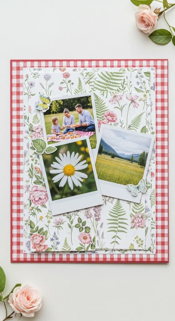 Mixing gingham and floral prints creates a cheerful and trendy layout. Use gingham paper as the base for a clean, structured look. Add a floral patterned paper behind your photo as a soft accent. Keep the color palette consistent so the prints don’t clash. Layering these two patterns adds interest without needing many embellishments. Trim edges with scissors for a handmade touch. This pairing works well for outdoor photos, family moments, or spring themes. It’s a simple way to make a page look thoughtfully designed.