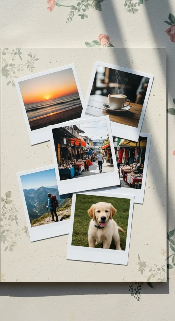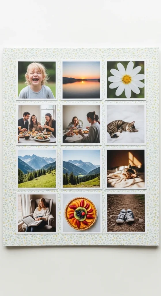 A monthly photo dump page gathers everyday memories in one place. Print several small photos from the same month. Arrange them in a simple grid or loose cluster. Keep the background plain so the photos stand out. Add a small label with the month and year. This layout feels casual but still organized. It’s perfect for beginners who want to document daily life without overthinking design.