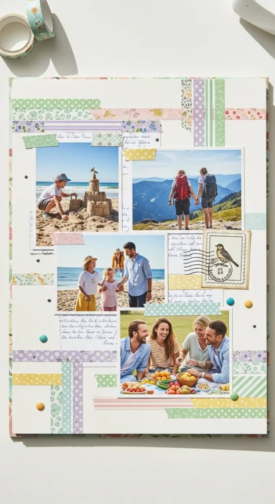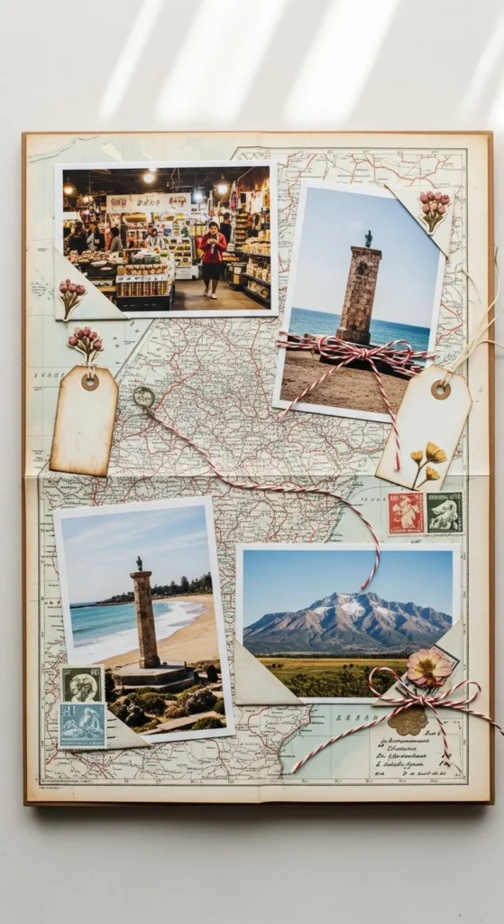 A travel memory map page highlights trips and adventures. Use a photocopy of a map as the background. Place photos from your trip on top, slightly angled for interest. Add small tags or paper arrows pointing to locations. Twine or string pieces can add texture. This layout is simple yet meaningful.