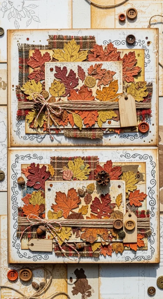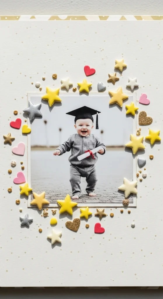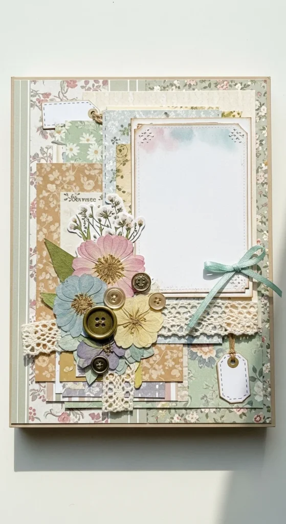 The vintage junk drawer style uses layered bits and pieces to tell a story. Gather scraps like old tickets, kraft paper, lace, and small printed images. Arrange them in overlapping layers like a collage. Don’t worry about perfect alignment; slight randomness adds charm. Use muted colors like beige, brown, and soft pastels for a nostalgic feel. Add a small photo in the middle so it doesn’t get lost. This design feels artistic and personal without needing precise measuring.