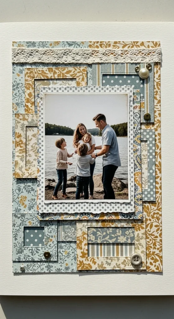 Layered paper frames add depth and color without needing many embellishments. Start by cutting one piece of cardstock slightly larger than your photo. Then cut two or three more pieces of patterned paper, each a bit larger than the last. Stack them behind the photo so the edges of each layer show. Keep the colors coordinated so the layers look balanced rather than busy. Slightly angle one layer for a playful touch. This technique makes the photo pop and fills space without extra stickers. Beginners find this helpful because the layers do most of the decorating work. You can use paper scraps for this idea, which keeps costs low. Finish the layout with a small sticker or label in one corner. The result looks polished while staying simple to assemble.