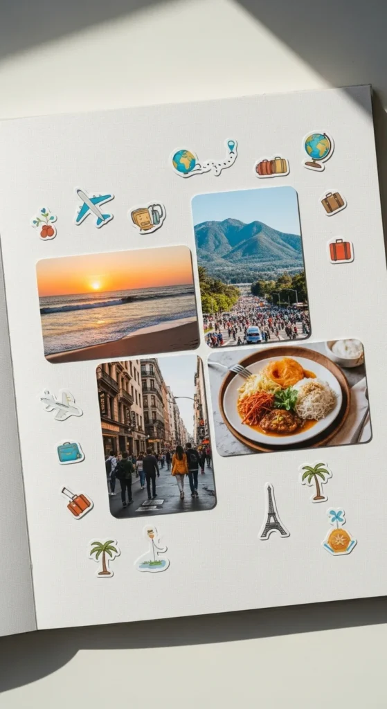 A sticker scatter page adds charm using just a few small decorations. Choose a sticker sheet that matches your theme, such as travel, flowers, or everyday icons. Place your photos on the page first so you know where space is available. Scatter stickers lightly around the edges of the photo cluster rather than spreading them everywhere. Keep most of the page clear to avoid a cluttered look. Use different sizes of stickers for variety while keeping colors consistent. This style is beginner friendly because it doesn’t require cutting or layering. It’s also easy to adjust if something doesn’t look right. A few well-placed stickers can make the page feel complete without overwhelming it. This works well for casual memories and daily snapshots.