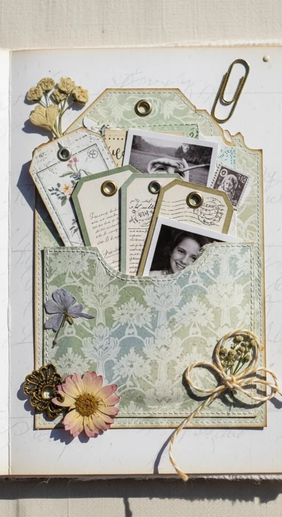 An envelope memory pocket adds both function and charm to your scrapbook. Glue a small envelope onto one corner of the page. Tuck extra photos, ticket stubs, or handwritten notes inside. Decorate the envelope with washi tape or a small sticker to match the theme. This creates an interactive element without adding clutter. Keep the rest of the page simple so the pocket stands out. You can also make your own envelope by folding scrapbook paper. This idea works well for travel memories, birthday notes, or special keepsakes. It’s an easy way to store more memories on one page.