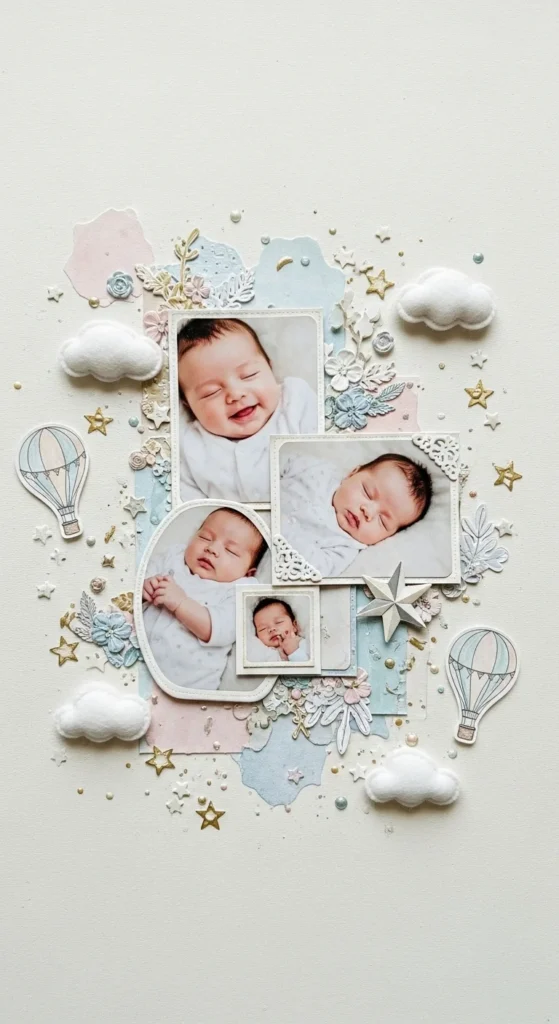 A baby memory board layout uses soft colors and simple shapes. Choose pastel patterned papers such as light pink, blue, or yellow. Arrange baby photos in a gentle cluster near the center of the page. Add a few small embellishments like stars, clouds, or hearts around the photos. Keep everything spaced out so the page feels calm and sweet. Avoid too many decorations, since baby photos already carry strong emotion. Beginners find this theme easy because the soft color palette guides design choices. Write a short note about the milestone or memory on a small card. This layout becomes a treasured keepsake over time.