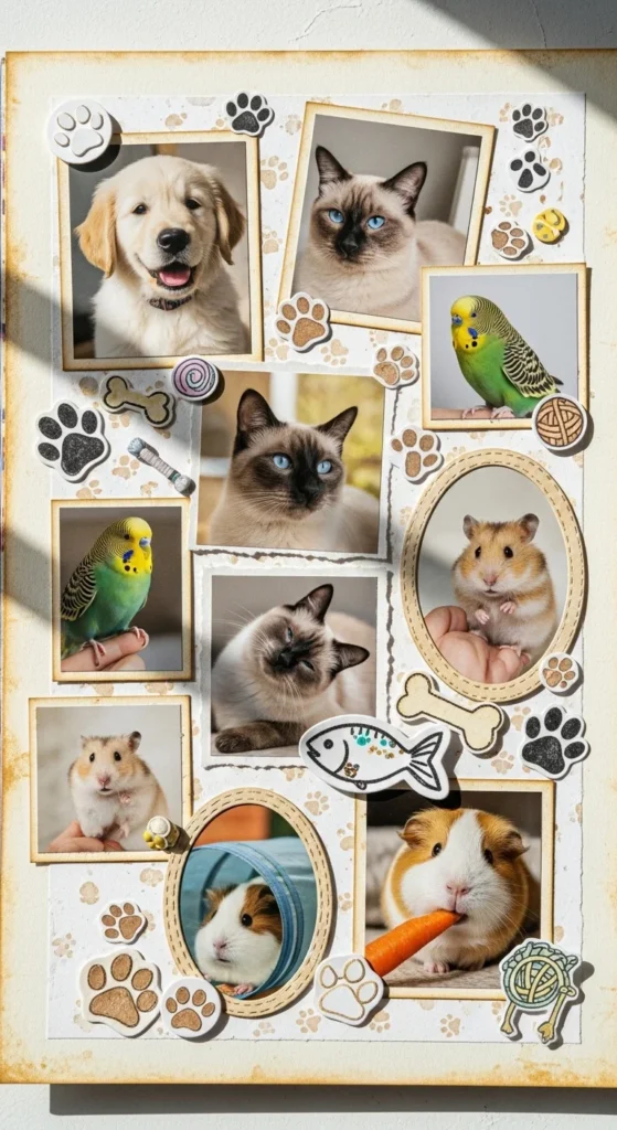 A pet theme page celebrates furry family members in a fun way. Choose photos of your pet playing, sleeping, or posing. Use patterned paper in soft browns, greys, or cheerful colors that match your pet’s personality. Add small paw print stickers or bone shapes around the photos. Keep the layout playful but not crowded. This design is easy for beginners because the theme guides decoration choices. Use a small tag to write your pet’s name or a funny habit. The result feels warm and personal without needing complex layers. Pet pages often become favorites in a scrapbook.