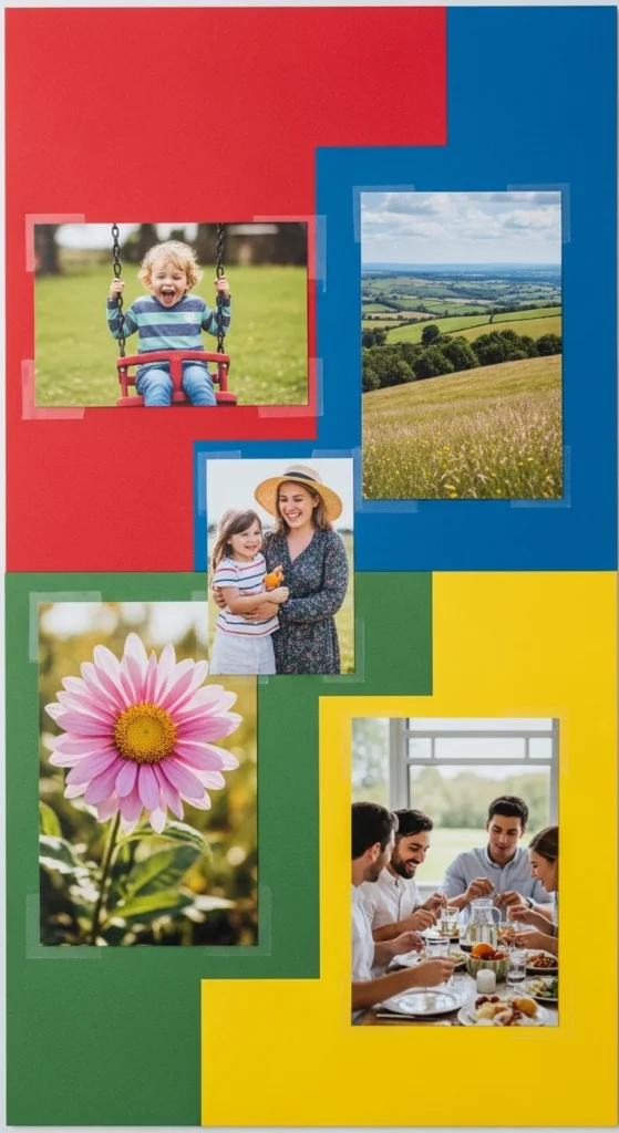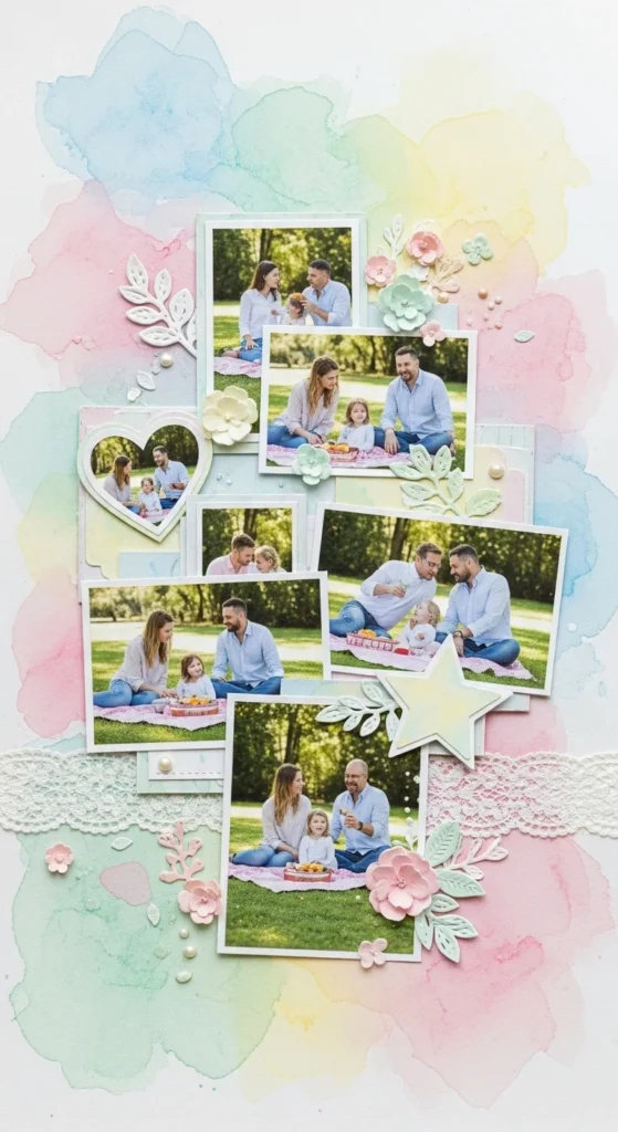 Grid layouts keep everything neat and balanced. Trim photos into equal sizes and arrange them in rows. Use patterned paper behind them for color. Add small embellishments only in a few corners. This helps beginners avoid clutter.