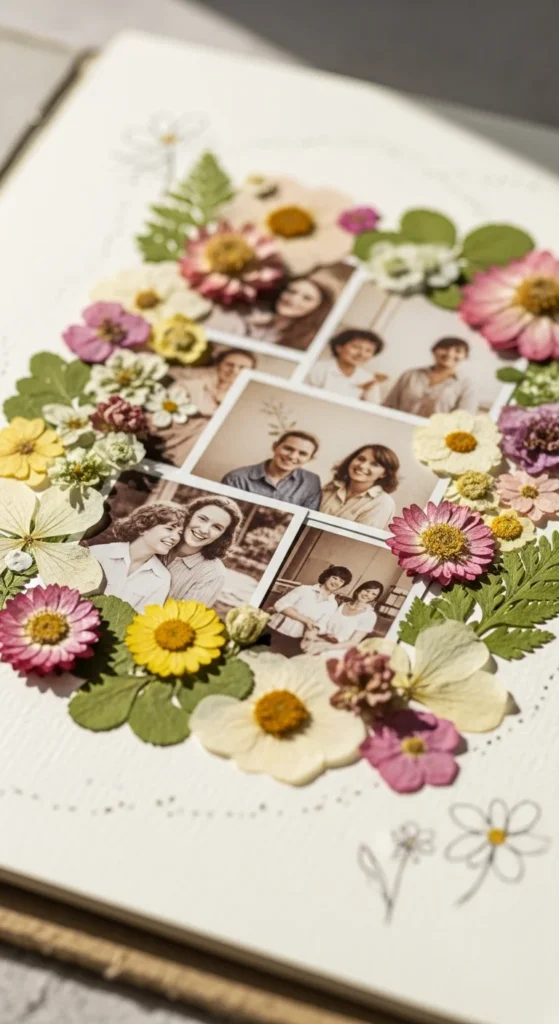 A pressed flower layout adds natural beauty and texture. Collect small flowers or leaves and press them between book pages for a few days. Once dry, glue them gently onto the scrapbook page around your photos. Use a clear-drying glue to keep the flowers in place. Keep the arrangement light so the page doesn’t feel heavy. This design pairs well with outdoor or garden photos. Beginners enjoy this idea because nature does most of the decorating work. The result feels soft, personal, and unique every time.