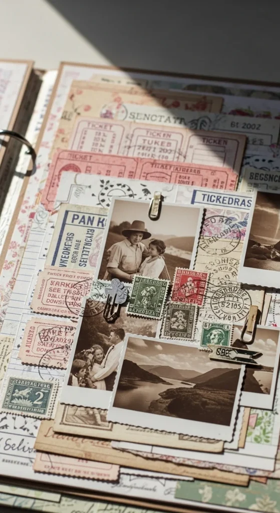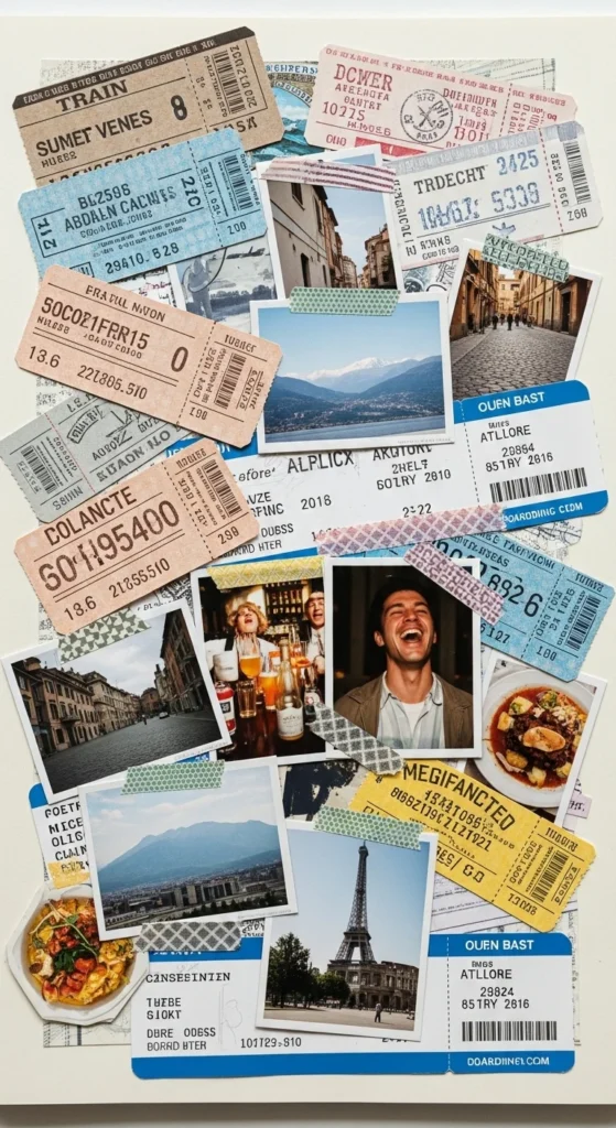 A travel ticket collage captures the feeling of a trip through small details. Gather ticket stubs, boarding passes, or museum entry slips. Arrange them in overlapping layers like a casual collage. Place a small photo on top so the page still has a focal point. Use soft colors in the background to keep the collage readable. This layout is simple and meaningful. Beginners enjoy it because the memorabilia adds interest without extra decorations. It turns everyday paper scraps into lasting memories.