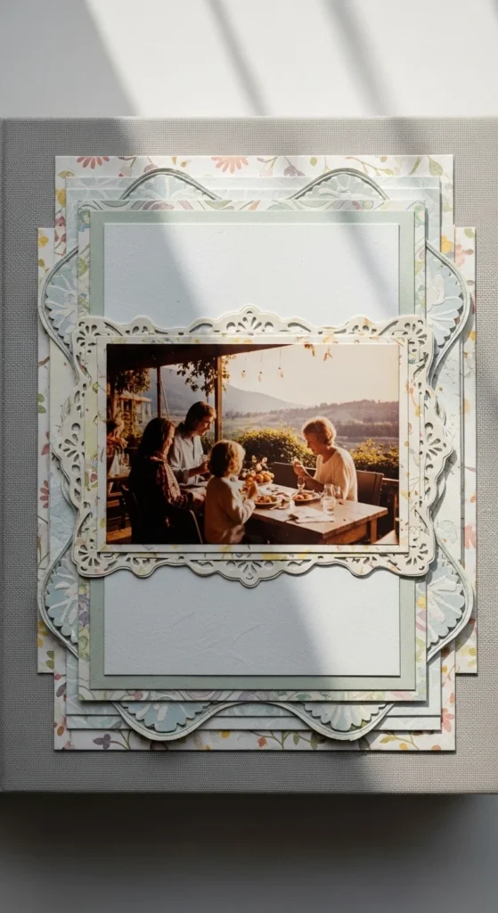 A themed color palette page looks polished with very little effort. Choose one color family, such as blues or warm neutrals. Use patterned papers and embellishments that stay within that range. Arrange photos on top, leaving some space between them. Keeping the palette limited makes the layout look cohesive. Beginners find this easier because color decisions are already made. It reduces clutter and helps the page feel calm. A small label or sticker in the same color family can finish the design.