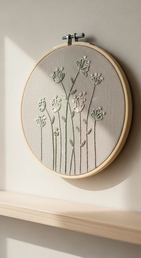A minimalist wildflower outline hoop is one of the easiest ways to make embroidery wall decor feel calm and stylish. The beauty comes from clean lines and soft spacing rather than heavy stitching. Use linen or cotton in cream, oatmeal, or dusty beige, then stitch a few thin flower stems with muted green, soft white, or pale blush thread. This kind of hoop looks lovely on its own, but it also works well in a set of two or three. That makes it great for filling a blank wall without spending much. You do not need many stitches either. A basic backstitch and a few tiny satin stitches for petals are enough. If you are new to embroidery, sketch the flower shape lightly with pencil first and keep the stems slightly curved for a softer look. Wooden hoops from craft stores are often cheap, and fabric scraps work perfectly for small pieces like this. The finished hoop feels airy, neat, and easy to style above a bed, desk, or reading chair. Simple floral outlines prove that embroidery can look graceful without being busy.