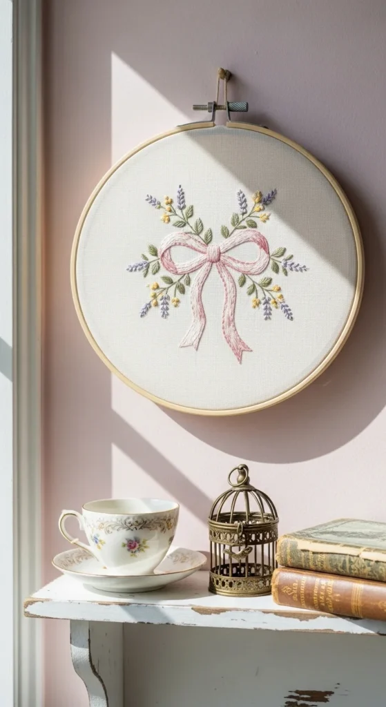 A bow hoop is a sweet idea that feels playful, soft, and very on trend for Pinterest-style decor. The design can be as simple as one ribbon bow stitched in the center with a few little flower sprigs or leaves around it. Use pink, cream, powder blue, or soft sage tones to keep the hoop light and charming. This project is good for beginners because the bow shape can be broken into easy curved sections rather than highly detailed pieces. It is also an affordable project since it does not need much thread. Pair it with neutral fabric and a small hoop to keep the look delicate. A bow hoop fits especially well in bedrooms, nursery corners, and vanity spaces. You can also create a pair by stitching one bow in blush and another in pale blue for a coordinated wall set. This style proves that embroidery hoop art can feel pretty and current without being hard to make. A small stitched bow can add exactly the right touch of sweetness to a soft feminine wall.