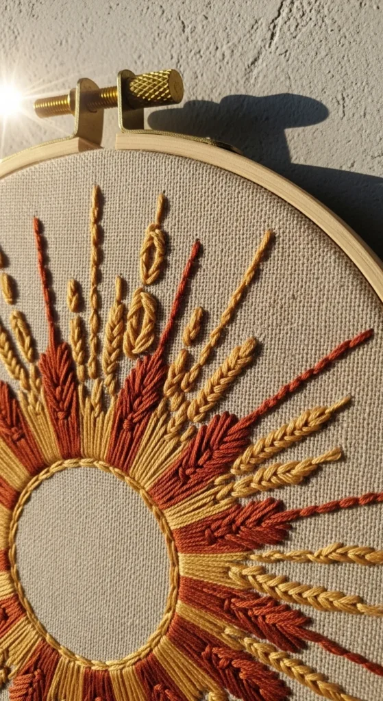 A celestial sunburst hoop gives embroidery wall decor a warm boho feel while staying simple enough for home crafters. Start with a small circle in the center, then stitch long radiating lines outward in pale gold, sand, rust, or terracotta. The design can be very minimal or slightly layered depending on how bold you want the piece to feel. It looks best on warm neutral fabric so the colors feel grounded and natural. This project is great if you like modern boho decor and want something that is less floral but still soft and handmade. Straight stitches do most of the work here, which makes it a very approachable design for beginners. It is also a smart way to use leftover warm-toned thread. A few rows of stitches can create a surprising amount of visual impact without taking much time. Hang it in a reading corner, hallway, or above a small shelf. The final look feels bright, earthy, and easy to mix with other natural textures like linen, rattan, and wood.