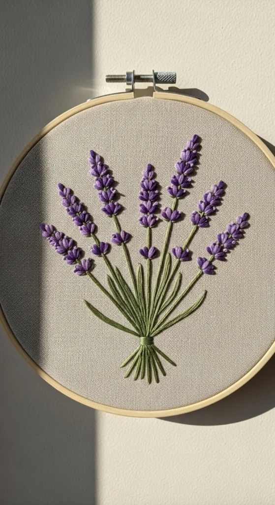 A 3D lavender sprig hoop adds a little dimension to embroidery art without turning the project into something too complex. Use oat or cream fabric as the base, then stitch a few slender green stems with clustered purple buds rising from them. To give the lavender a raised look, layer the stitches slightly and keep the buds fuller than flat floral stitching. This creates texture that catches the light nicely on the wall. The hoop feels delicate and natural, which makes it a good match for bedrooms, bathrooms, and entry tables with simple decor. Lavender is also a smart choice because the shape is repetitive and forgiving. If the buds are not perfectly even, the piece still looks charming. This idea works well in a medium hoop and does not need many materials beyond basic floss and neutral fabric. Pair it with natural wood or paint the hoop soft white for a lighter finish. The final result feels a little more detailed than a simple floral outline, but it still stays affordable and very achievable for a weekend project.