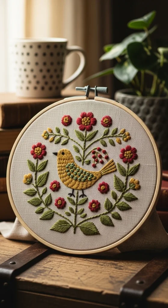 A vintage folk motif hoop brings warmth and character to a wall, especially if you love old-world patterns and handmade decor with a bit more story. Think simple birds, tulip shapes, leafy vines, and curved stems in muted red, mustard, dusty blue, and olive green. The colors can stay earthy so the hoop still feels soft enough for a modern home. This style looks especially good on natural linen because the texture supports that slightly rustic folk-art look. You do not need to fill the entire hoop either. A small central bird with a few surrounding flowers can already feel complete. This project is a good one for slow stitching because each shape can be built in layers without rushing. To keep costs lower, choose a small palette and repeat the same colors across the whole motif. A vintage folk hoop works beautifully in kitchens, hallways, and craft rooms. It adds personality without feeling loud. If your decor leans warm, collected, and handmade, this type of embroidery art can make the wall feel more interesting right away.
