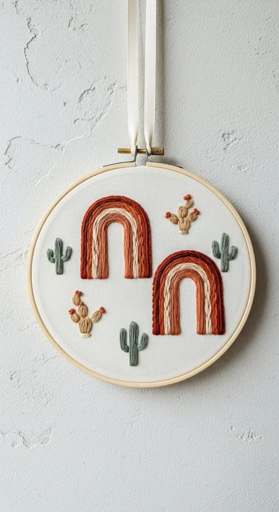 A terracotta desert arch hoop is perfect for modern boho spaces that use warm earthy colors and simple shapes. The design can feature layered arches, a sun, little cacti, or abstract desert hills stitched in terracotta, sand, muted clay, and warm cream. This style looks stylish because it mixes geometric structure with handmade texture. It is also easier than it appears. Most of the design can be built from curved lines, filled arches, and a few simple plant shapes. This makes it a great option for people who like contemporary decor but still want something personal and handmade on their walls. If you already have warm-toned thread from other projects, this is an easy way to use it up. Pair the hoop with natural wood, woven baskets, and linen for a very Pinterest-friendly look. It works beautifully in living rooms, bedrooms, and home offices. The finished piece feels current, warm, and artistic without asking for detailed floral work or a very large supply list.