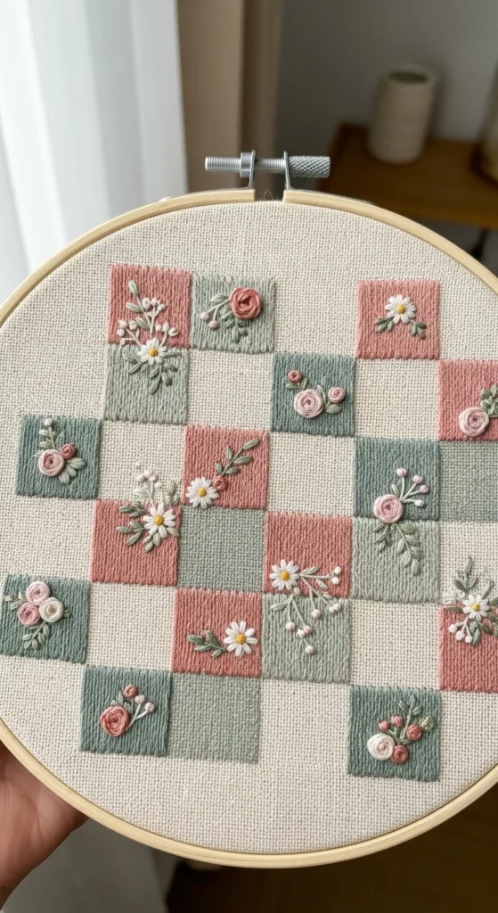 A checkerboard floral hoop mixes playful pattern with gentle handmade detail, which makes it a fun choice for a younger-feeling wall or craft room display. Use a simple stitched checker pattern in cream and blush, beige and sage, or dusty blue and sand. Then add a few tiny flowers scattered through some of the squares to soften the design. This keeps the hoop from feeling too rigid while still giving it a modern edge. Because the squares are repetitive, this project is easier to plan than a freeform floral pattern. You can mark the grid lightly with pencil and fill it bit by bit. It also works well with leftover thread since each color is used in small sections. This hoop looks especially cute paired with other playful designs like bows, daisies, or fruit motifs. It brings color and personality without needing very advanced stitches. If you want embroidery hoop art that feels handmade but still a little graphic and modern, this is a very strong option. The final look is cheerful, neat, and easy to style.