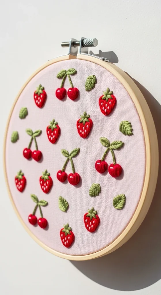A tiny fruit hoop is charming, cheerful, and surprisingly stylish when kept small and simple. Little strawberries, cherries, pears, or lemons can look adorable on soft linen or pastel cotton, especially when the design leaves plenty of empty space around the stitched shapes. This makes the hoop feel more curated and less like a crowded pattern. Fruit motifs are also good for beginners because they can be built from very simple shapes and a few basic stitches. A strawberry needs only a small red form, tiny seed dots, and a green cap. That means you can create something cute without a lot of complicated thread work. This style is especially good for kitchens, breakfast nooks, craft corners, or playful bedroom walls. It is also very budget friendly because each design uses so little thread. A group of three small fruit hoops can look beautiful together and gives you a lot of wall charm from simple supplies. The final result feels fun, handmade, and full of personality without being overwhelming.