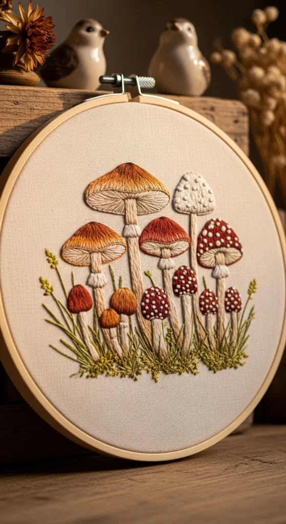 A mushroom meadow hoop has a cozy woodland feel that suits cottage-inspired spaces so well. Use oatmeal or warm beige fabric as the base, then stitch a few mushrooms with soft rust, cream, brown, and moss green thread. Add little grass lines or tiny dots around them to suggest a forest floor without filling the whole hoop. This design works because mushrooms already have strong shapes, so even simple stitching looks charming. It is a nice option if you want something whimsical but not overly sweet. The earthy tones also make it easy to style with natural wood, dried flowers, and linen decor. To keep the project inexpensive, make one medium hoop rather than several large ones. A mushroom design can stand on its own very well. If you like, add a tiny moon or fern leaf for more atmosphere. This hoop is especially lovely in reading corners, craft rooms, or bedrooms that lean soft and natural. It feels a little magical while still staying warm, handmade, and easy to create.