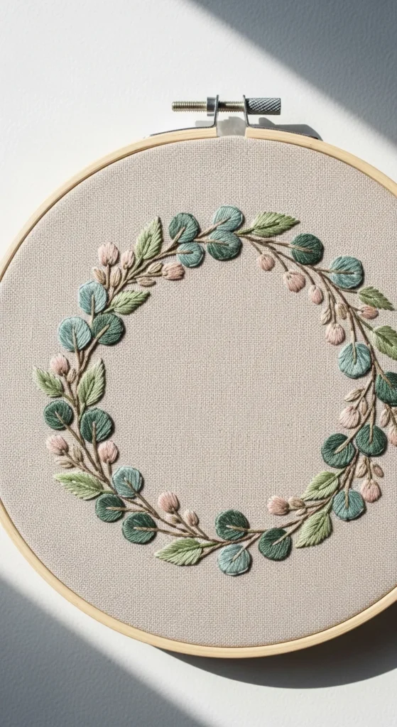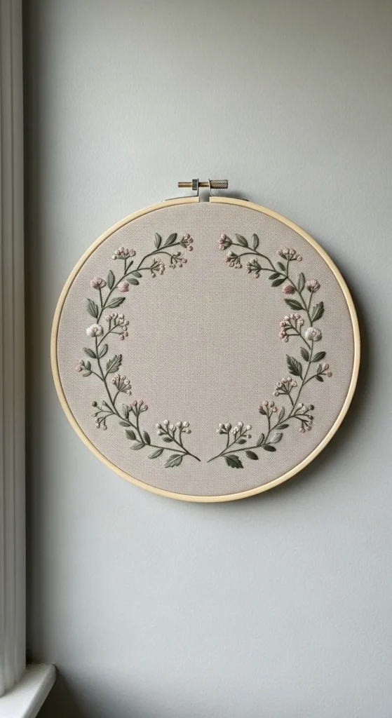 A botanical wreath hoop is a classic embroidery idea because the circular design fits the hoop shape so naturally. It feels balanced, elegant, and easy to adapt for any room. Use olive, sage, dusty green, or muted brown thread to stitch a loose wreath of leaves around the outer edge, leaving the center mostly open. That open space keeps the piece feeling calm and uncluttered. You can add a few small berries or tiny bud shapes in blush, cream, or faded mustard for a bit more warmth. This project is friendly to beginners because you can repeat the same leaf shapes all around the circle without needing a very complex pattern. It is also low cost because it uses small amounts of thread and works well on leftover neutral fabric. Hang one on its own for a quiet look, or group several wreath hoops in different sizes for a soft gallery wall. This style fits bedrooms, entryways, and craft spaces beautifully. It gives you that Pinterest-worthy handmade look without asking for fancy supplies or difficult stitch work.