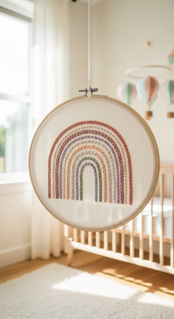 A rainbow pastel arch hoop is a lovely way to add soft color to a wall without making it feel childish or loud. Use muted shades like blush, peach, butter, sage, lavender, and dusty blue rather than bold rainbow colors. Stitch simple layered arches across the hoop and leave plenty of open fabric around them. This negative space is what helps the hoop feel more aesthetic and less busy. The project is friendly to beginners because it relies on repeated curved lines rather than detailed motifs. It is also a smart way to use leftover thread from other pastel projects. This style looks beautiful in nurseries, craft rooms, or anywhere you want a light cheerful touch. Pair it with neutral decor and natural wood for a softer look. If you want extra detail, add a few tiny stars, dots, or a small sun above the arches. The result feels playful, modern, and very Pinterest-worthy while still staying simple enough for an easy weekend project.