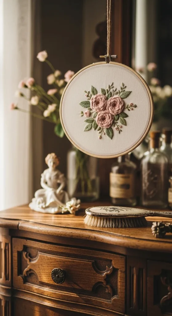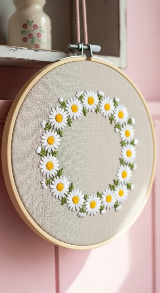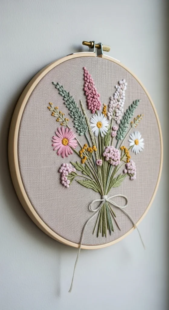A meadow bouquet hoop gives the feeling of wild gathered flowers without needing a very formal floral layout. Instead of spacing flowers evenly, cluster them together like a hand-tied bouquet with stems meeting at the bottom and blossoms opening above. Use small daisy shapes, tiny buds, and leafy stems in muted pink, cream, sage, and dusty lavender. This style works beautifully because it feels natural and slightly imperfect in the best way. You do not have to make every flower match. That relaxed look is part of the charm. It is also a good project for using leftover thread in soft floral colors. A bouquet hoop feels lovely in bedrooms, hallways, or beside mirrors and dressers. If you want to keep it inexpensive, use a small hoop and just a few flower types repeated throughout the design. Tie a real ribbon at the stitched bouquet base for a little mixed-media touch if you like. The final result feels soft, handmade, and very romantic without being too formal.