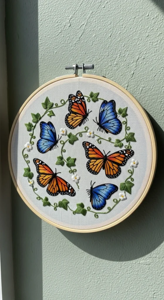 A butterfly and vine hoop has a light whimsical feel that works beautifully in feminine or nature-inspired rooms. Stitch one or two delicate butterflies with open wings near the center or upper half of the hoop, then add a few winding vines or tiny leaves around them. Soft thread colors like sage, cream, pale gold, dusty blue, and blush keep the piece elegant. This design looks especially good when the butterflies are not overfilled. A mix of outline stitching and a few small filled areas helps them feel airy. This project is nice for people who want a nature theme that is softer than a full floral arrangement. It also works well on neutral fabric and does not require a huge number of thread colors. A small hoop is enough for the design to make an impact. Hang it near a window, bed, or vanity area where the light can catch the thread texture. The final look feels graceful and a little whimsical, which makes it a lovely fit for handmade wall decor that still feels light and polished.
