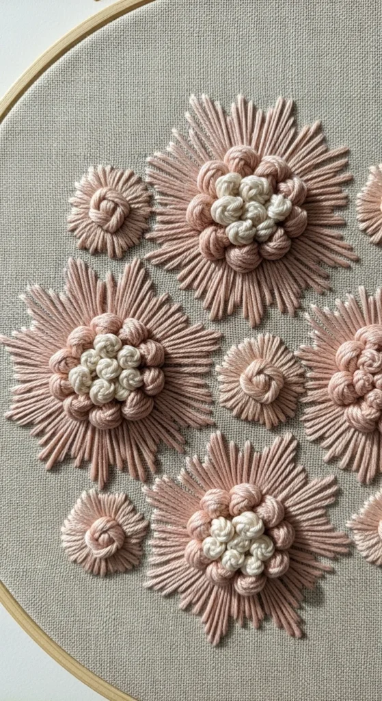 A textured flower hoop built around French knots can add a lot of depth to a wall while still using a very simple floral idea. Start with one or two flowers or a small cluster, then use French knots for the flower centers or even for whole blossom shapes. This creates a raised texture that catches light in a very pretty way. Pair the knots with a few lazy daisy petals, tiny leaves, or short stem stitches so the hoop feels balanced. If you are nervous about French knots, practice them on scrap fabric first. Once you get the motion right, they become much easier and can make a hoop feel much more detailed without adding many new supplies. This style works especially well in soft blush, cream, sage, and dusty mauve. It is a lovely project for bedrooms, hallways, or small gallery walls where texture matters. The finished hoop feels rich and tactile, but still very soft. It is a great example of how one simple stitch can completely change the look of handmade wall art.