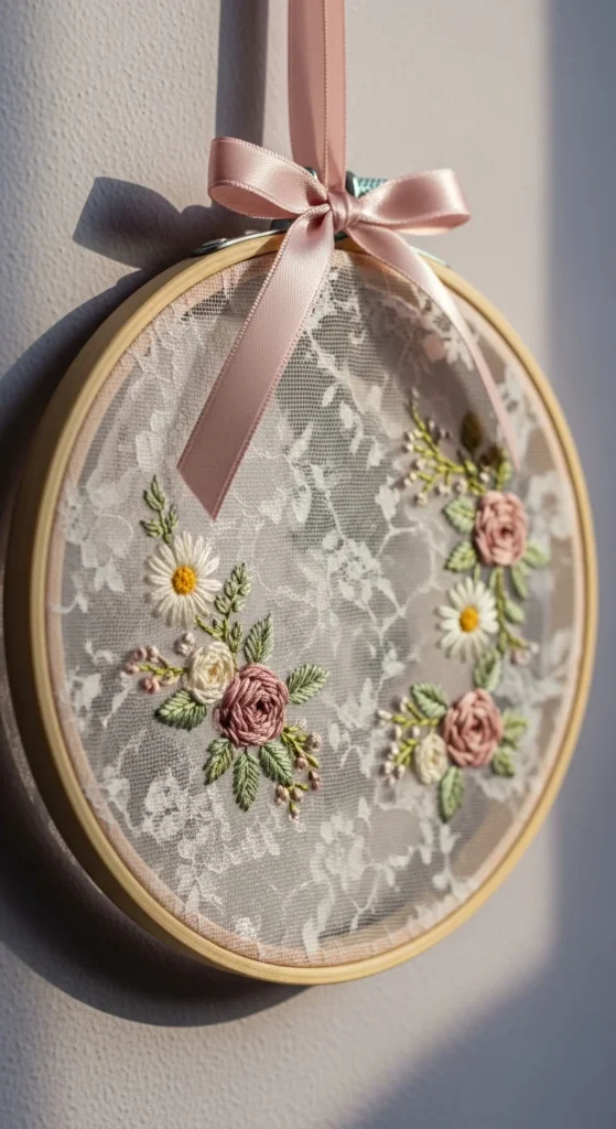 A mixed media lace hoop is perfect when you want wall decor that feels soft, delicate, and a little vintage. Start with a layer of lace, sheer fabric, or embroidered tulle stretched in the hoop, then add a few stitched flowers, leaves, or bows on top. Because the base already has texture, you can keep the embroidery very light. That helps save thread and stitching time while still giving the final hoop a beautiful layered feel. This style looks especially nice in bedrooms, nurseries, or dressing areas with romantic decor. If you already have leftover lace from old clothing, gift wrap, or fabric scraps, this becomes a very budget-friendly project. Use neutral tones like cream, blush, dusty rose, and soft beige for the most elegant result. A velvet ribbon hanger can make the hoop even prettier without much extra work. This idea is less about heavy embroidery and more about combining textile textures in a thoughtful way. The final piece feels light, graceful, and very easy to fall in love with on a soft wall.