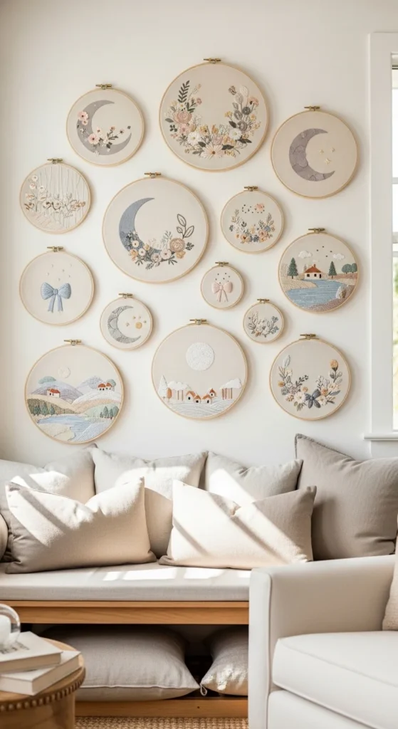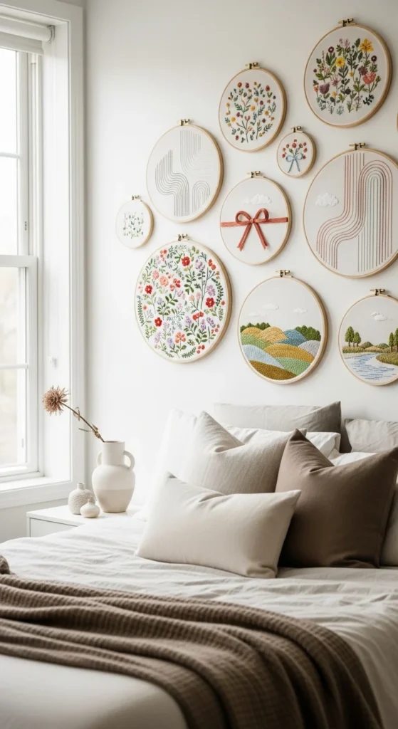 A layered gallery hoop set is one of the best ways to make embroidery wall decor look finished and styled. Instead of creating one large piece, make three to five smaller hoops in related colors and themes, then arrange them together. You can mix a floral outline, a bow hoop, an abstract line piece, and a tiny landscape as long as the palette feels connected. This is a smart option because it lets you use leftover fabric, thread, and hoops from other projects. It also takes some pressure off each individual design. A simple hoop can look much more impressive when it is part of a group. Keep the colors soft and repeated across the set, such as cream, blush, sage, terracotta, or dusty blue. Layout matters too. Place the largest hoop slightly off-center and build outward with smaller ones for a more relaxed look. This idea works beautifully above beds, desks, or console tables. It turns small handmade pieces into something that feels curated, personal, and very Pinterest-worthy without requiring one huge complicated project.