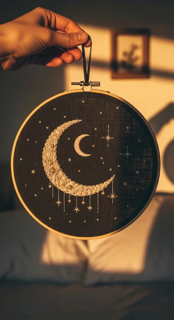 A moon and stars hoop is perfect when you want embroidery wall decor that feels dreamy but still simple. Use deep navy, charcoal, or dusty midnight fabric as the base, then stitch a crescent moon in cream, pale gold, or soft beige. Scatter small star stitches around it with a little extra spacing so the piece stays elegant. A touch of metallic thread can look beautiful here, but use it lightly. Too much shine can make the hoop feel busy. This is a good project for bedrooms, nurseries, and reading corners because the theme feels calm and cozy. It is also a nice option if you want something less floral. If you are keeping costs low, skip specialty thread and use warm yellow floss for the stars instead. Even basic stitches can look lovely against dark fabric. A small bow at the hoop top or a velvet ribbon for hanging can make the finished piece feel a bit more styled. This idea is soft, magical, and easy to make in a way that still looks polished on the wall.